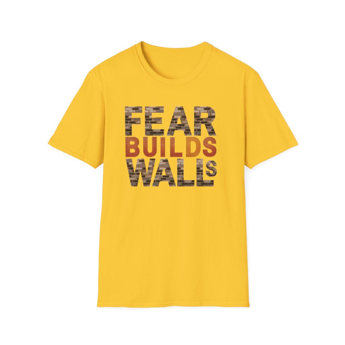 FEAR builds WALLS: This unisex soft-style t-shirt puts a new spin on casual comfort. Made from very soft materials, this tee is 100% cotton for solid colors. Heather colors and sports grey include polyester. The shoulders have twill tape for improved durability. There are no side seams. The collar is made with ribbed knitting to prevent curling damage.