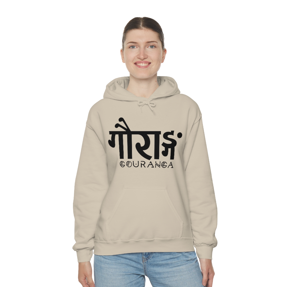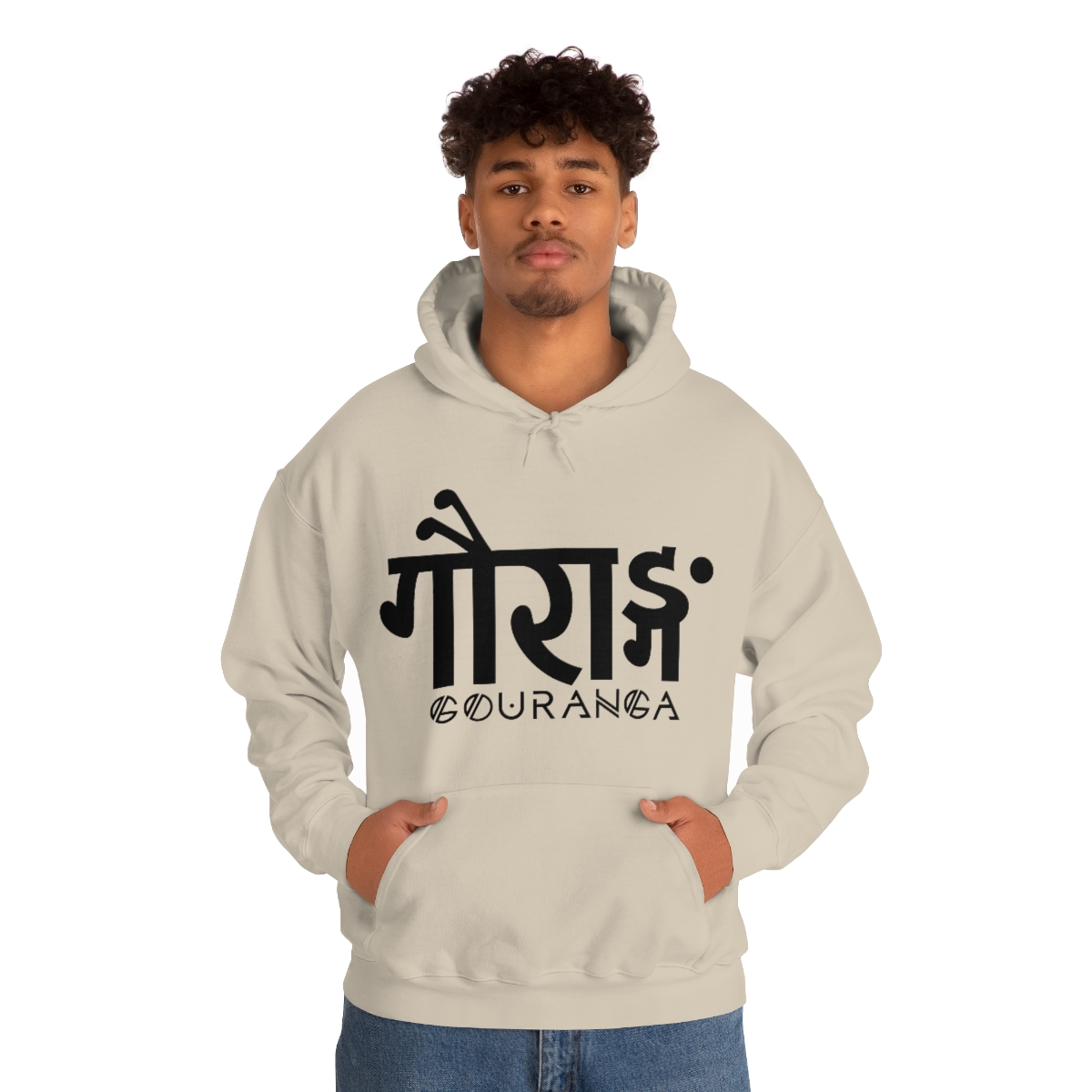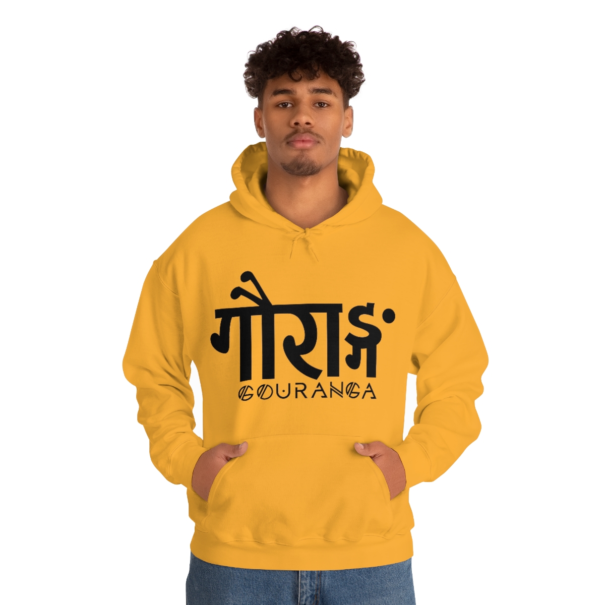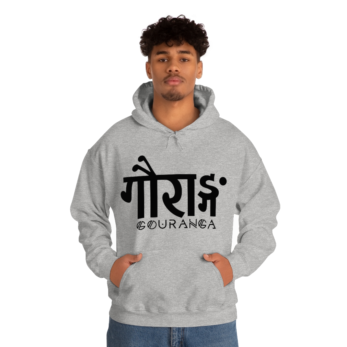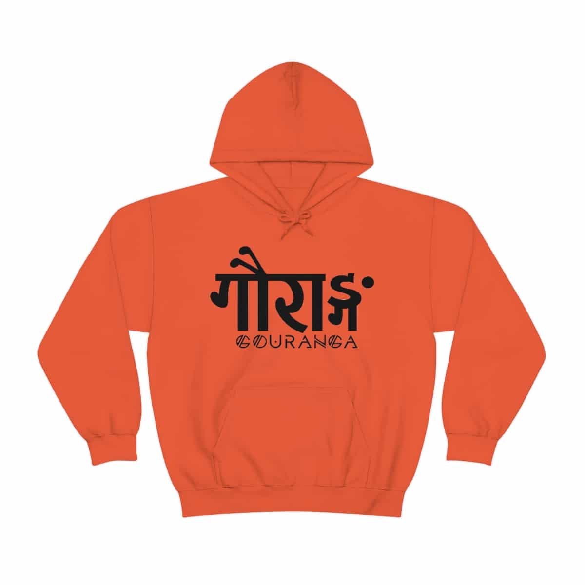 GOURANGA Sanskrit unisex heavy blend hooded sweatshirt is relaxation itself. The material is a thick blend of cotton and polyester. This makes for a plush, soft feel alongside warmth. It’s also a great surface for printing. There are no side seams. A spacious kangaroo pocket hangs in front. The hood’s drawstring is the same color as the base sweater.