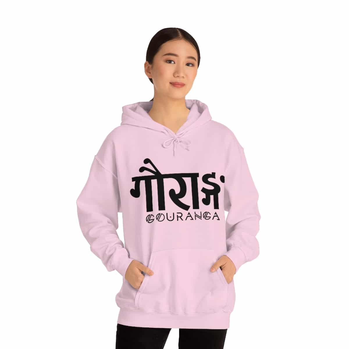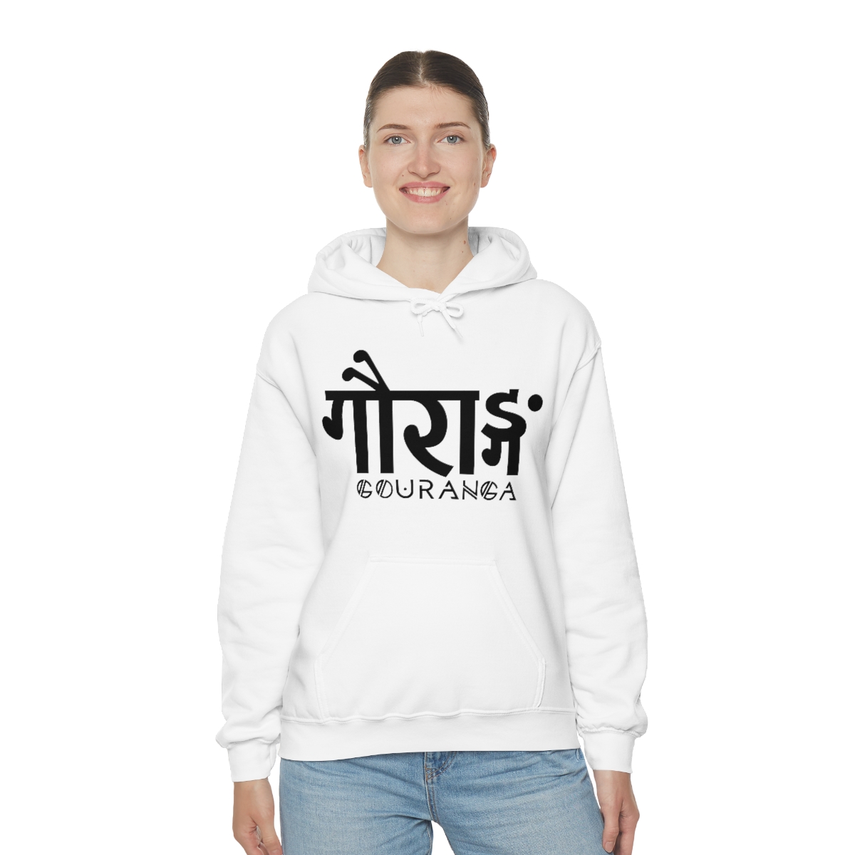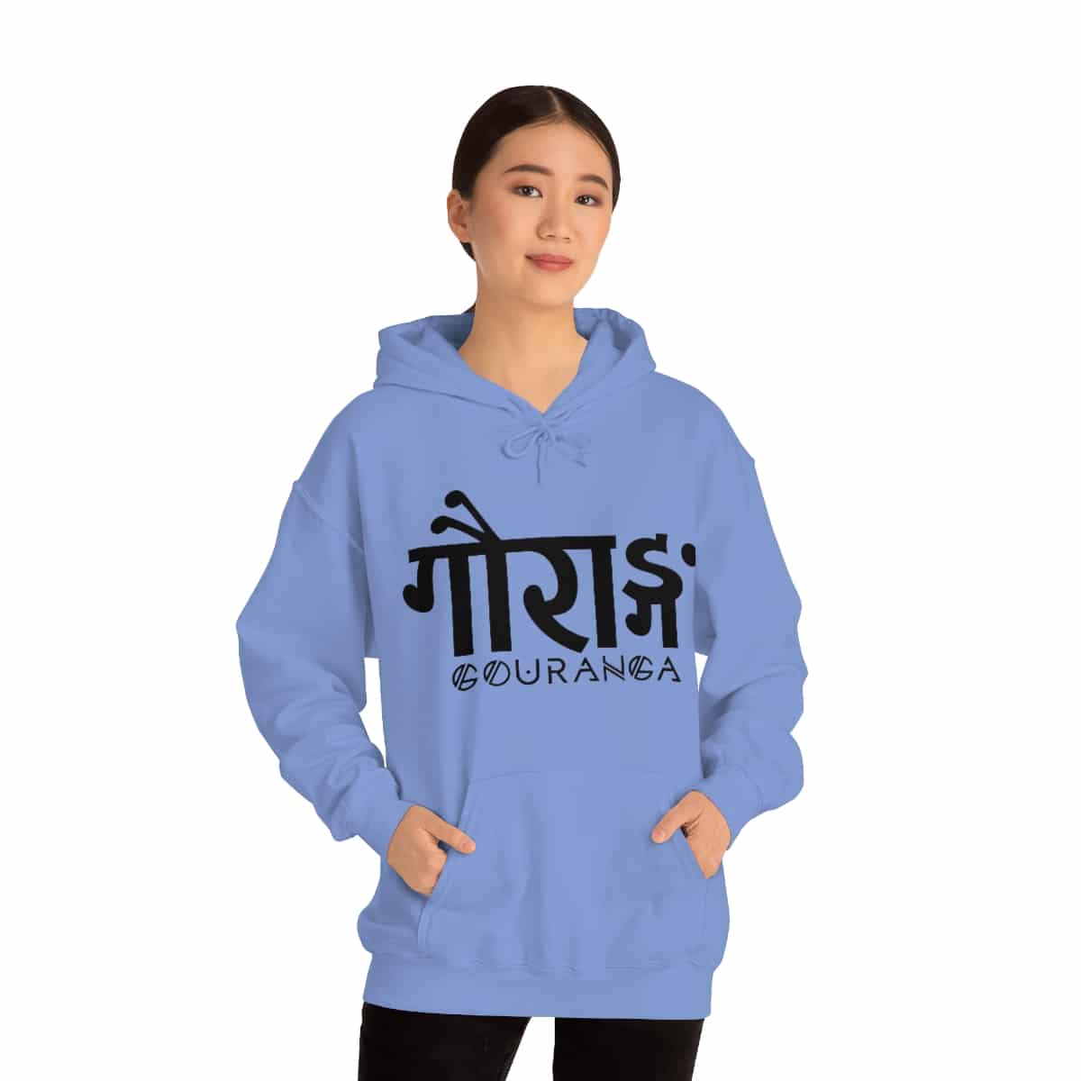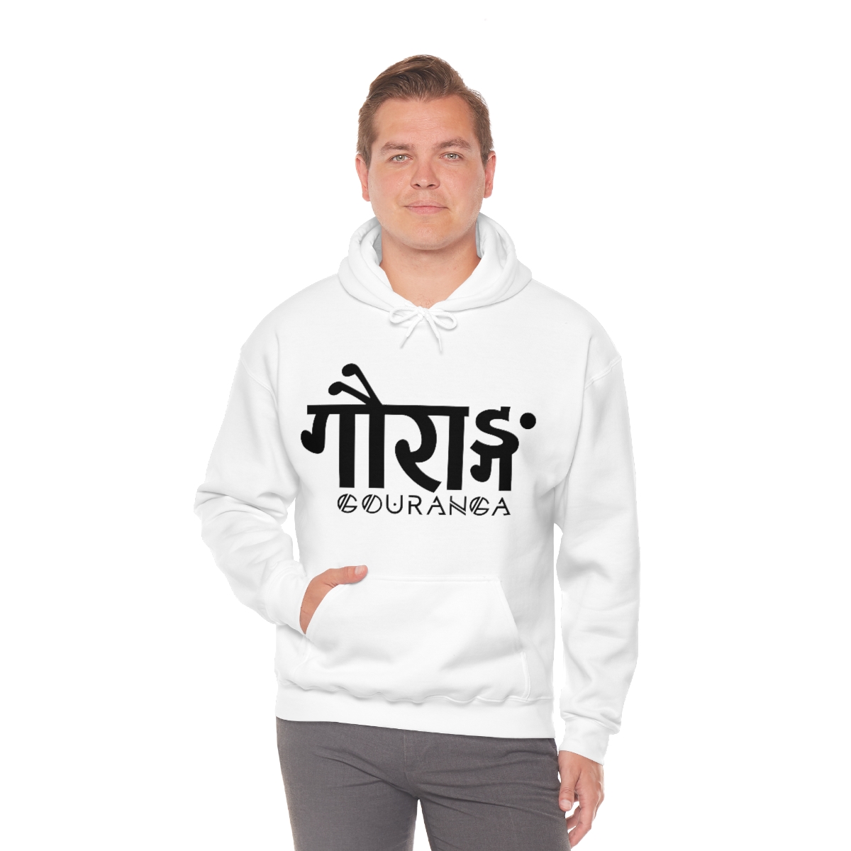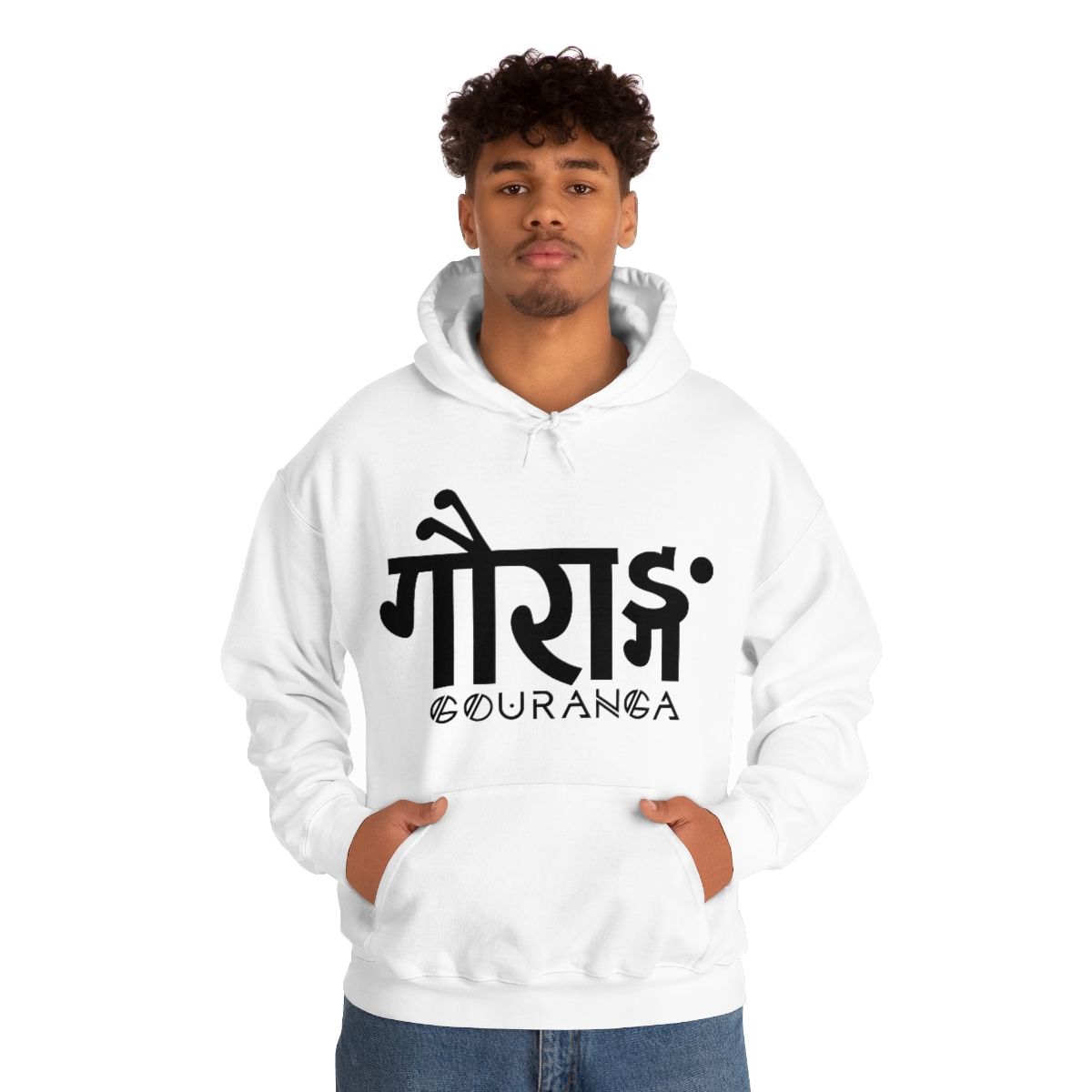 GOURANGA Sanskrit unisex heavy blend hooded sweatshirt is relaxation itself. The material is a thick blend of cotton and polyester. This makes for a plush, soft feel alongside warmth. It’s also a great surface for printing. There are no side seams. A spacious kangaroo pocket hangs in front. The hood’s drawstring is the same color as the base sweater.