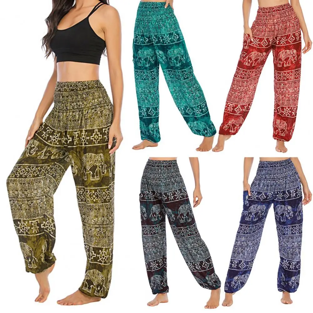 Yoga Pants Thai Cotton Silk High Waist Ankle Length Loose Fit Wide Elastic Waist, Elephant PrintOne Size,
